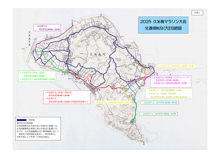 14日 10月 2025 2025久米島マラソン交通規制、迂回路について 久米島マラソンを開催するにあたり大会当日である10月26日(日)には競技時間中交通規制がございます。 上記の図のとおり規制されますので、島内を移動の際には図内にございます迂回路を利用し移動をお願いいたします。 大会の安全な運営の為、ご協力のほどよろしくお願いいたします。 2025交通規制及び迂回路図.pdf PDFファイル 243.1 KB ダウンロード tagPlaceholderカテゴリ: 2025久米島マラソン
