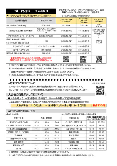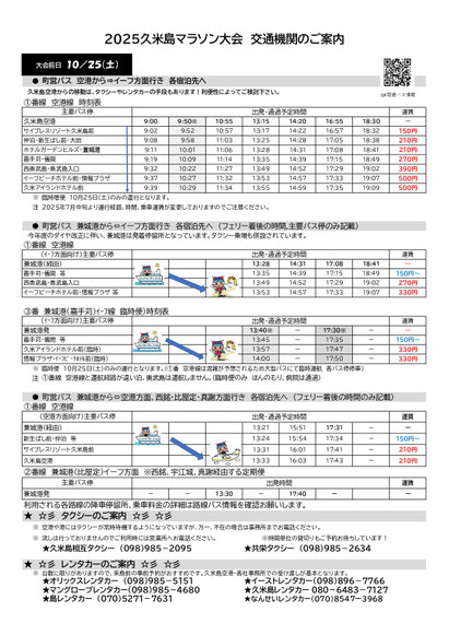 20日 10月 2025 2025久米島マラソン交通案内について 今年の大会も大会前日10/25(土)と当日10/26(日)のみの特別な交通対応を行います。 島外参加者向けにゼッケンと一緒に事前に発送しておりますが、大会HPでも改めてご案内いたします。 ご来島の際はぜひご利用ください。 また今年から島内のバスの運行ダイヤが変更になった事もあり、昨年までとは案内の内容もかなり変わっておりますので、お気を付けくださいませ。 2025久米島マラソン交通機関のご案内.pdf PDFファイル 1.8 MB ダウンロード tagPlaceholderカテゴリ: 2025久米島マラソン